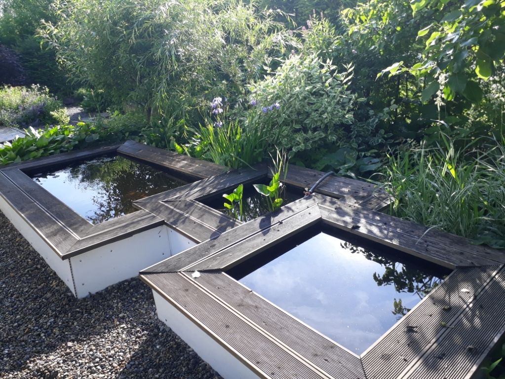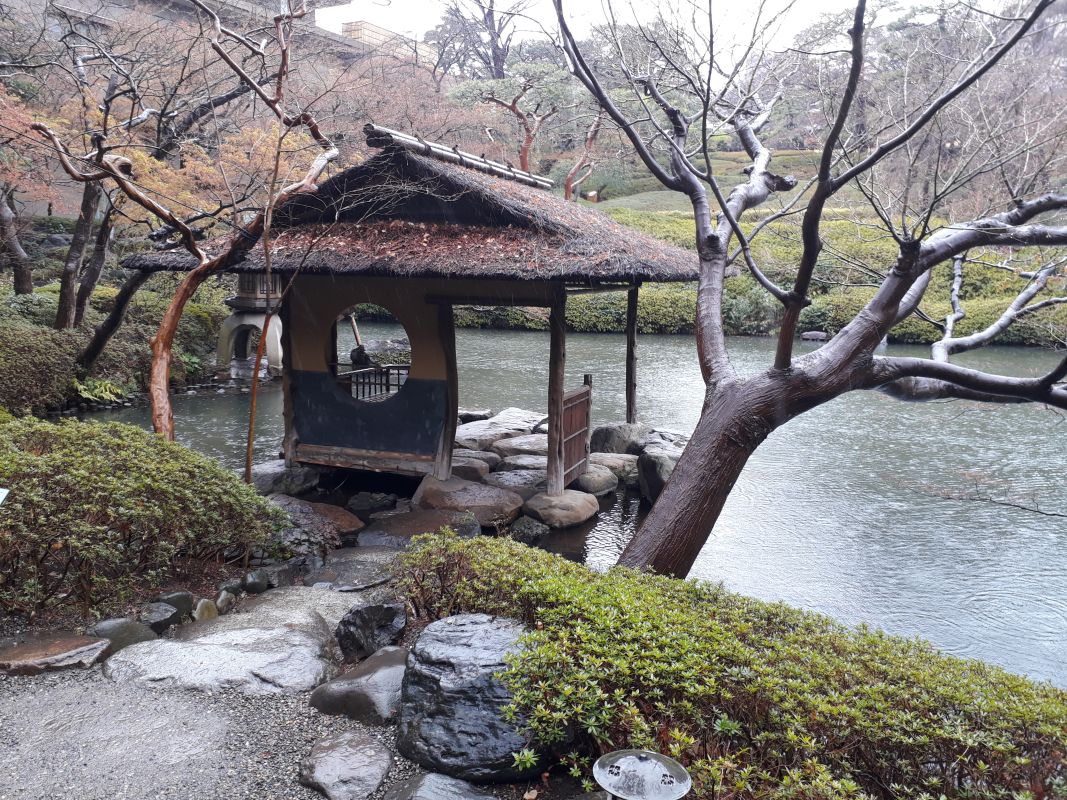 В центре сада водоем с беседкой на берегу для любования пейзажными картинами, медитации или просто отдохнуть, побеседовать. Окно в беседке имеет форму круга и обычно располагается на северной стороне. А как только присядешь — тут же подплывают рыбки кои, яркие, как красные маяки в воде.