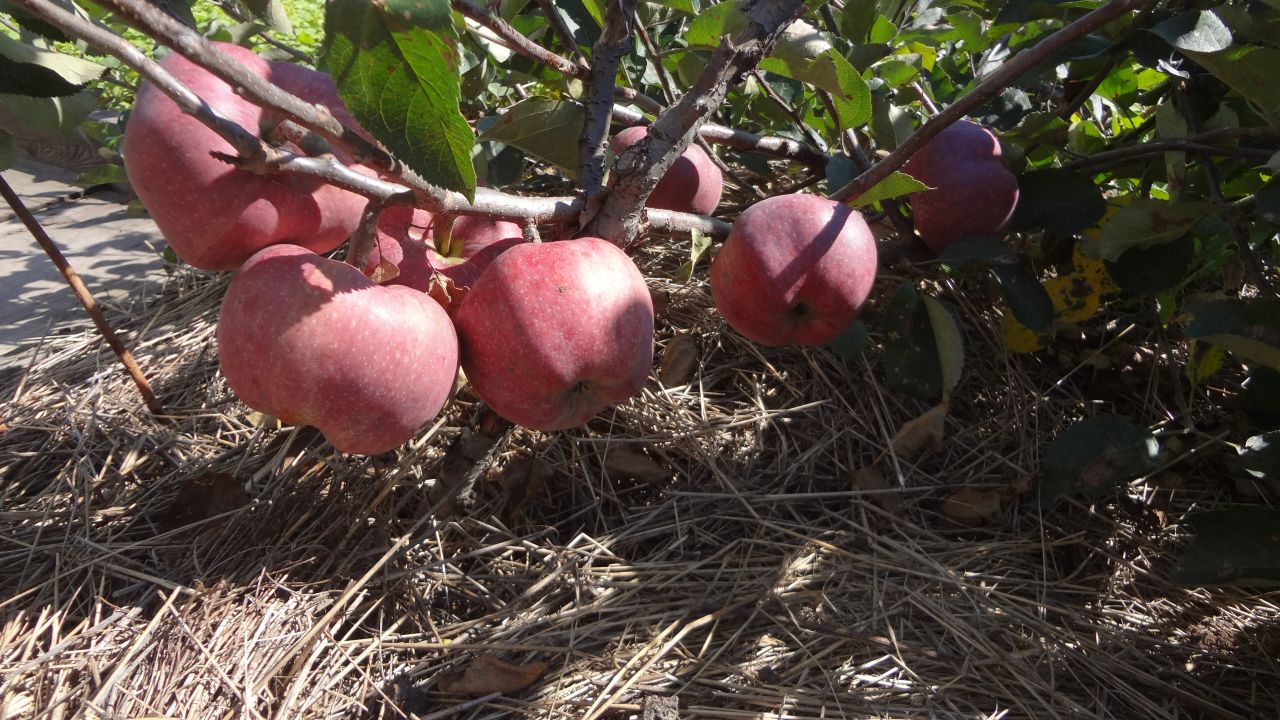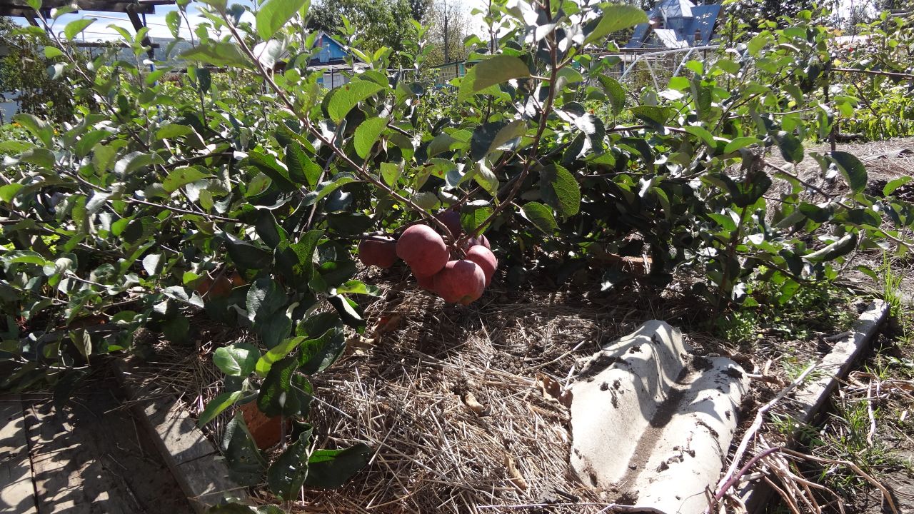 Стланцевый сад Сергея Силина производит неизгладимое впечатление: плодовые деревья аккуратно пригнуты к земле и закреплены скобами. Плотность посадки такая, что для того, чтобы сфотографировать спелые плоды, приходится вставать на колени.