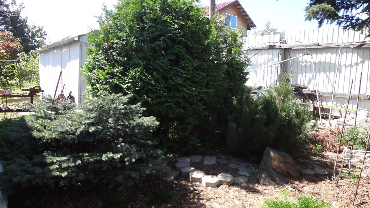 У входа во двор растут высокие стройные туи и сосны. Рядом раскинулся дёрен — дерево с зелёными листьями, обрамлёнными белой каймой. Чуть поодаль расположились миниатюрные туи, тисы, кипарисовики, карликовая пихта, микробиота, можжевельники, японские хвойники и даже женьшень и настоящая лиана…