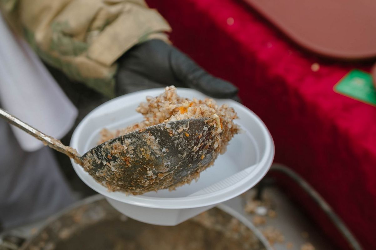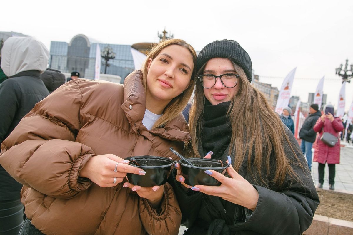 Не меньше народа собралось и у точки раздачи гречневой каши. Рыжеволосая женщина в форме бойко раздавала тарелки с ароматным блюдом, а мужчина рядом разливал сладкий черный чай. Довольные хабаровчане, получив заветные порции, спешили к специальным столам у центрального фонтана.