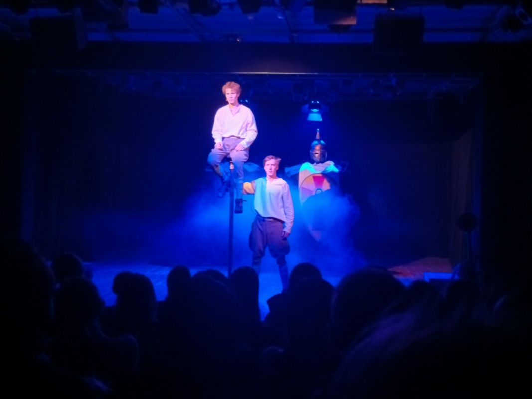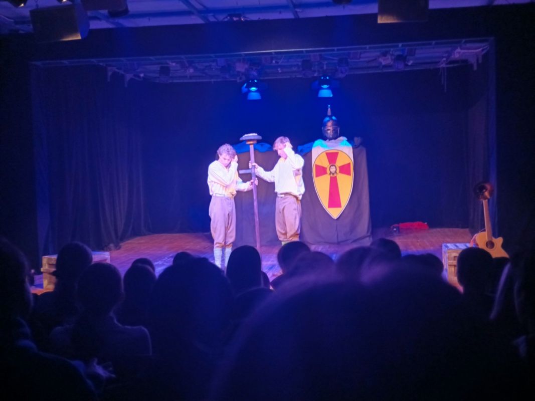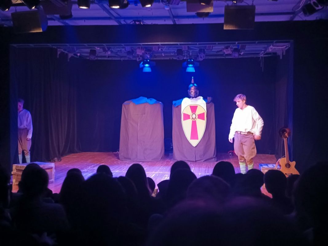 Артисты — шикарные Валерий Голендухин и Артём Тюников — играют и поют здесь вживую, без фонограммы, снимая излишний пафос воспеваемого ныне героизма и словно вступая в диалог со зрителем. По тюзовской традиции лаконичные декорации трансформируются по ходу действия, к примеру, превращаясь из стены или берегов реки в военные костюмы, а потом даже в тевтонских рыцарей и богатырей! И безусловный герой Василий Теркин, проходя через все смертельные схватки и ужасы войны, тоже словно оживает для потомков, сохраняя юмор и тепло живой души.