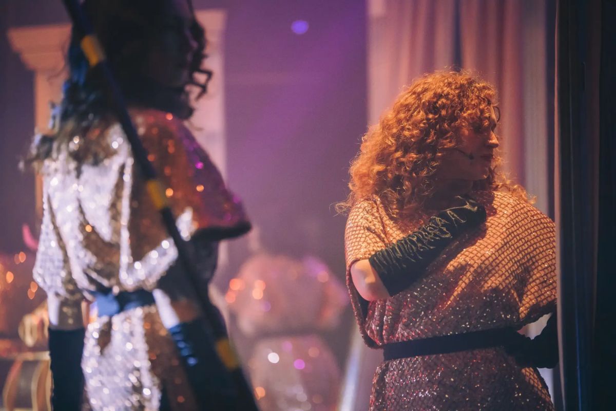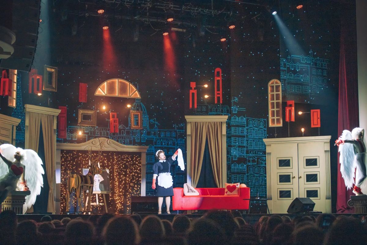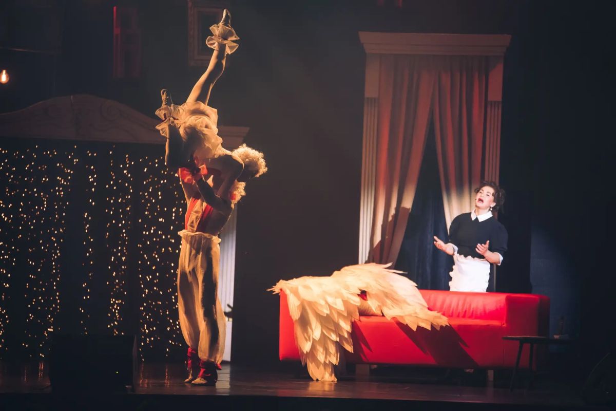 И воздух на сцене действительно есть — нет замыкающих стен, только волшебство мерцания. Громова внедрила в декорации световые точки, большие декоративные лампы и целый портал из светящихся гирлянд, из которого появляются два Купидона — мифические персонажи-зачинщики, свидетели всего происходящего.