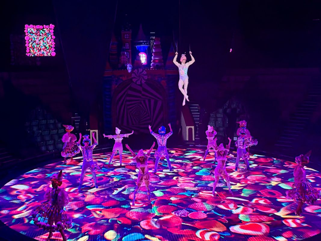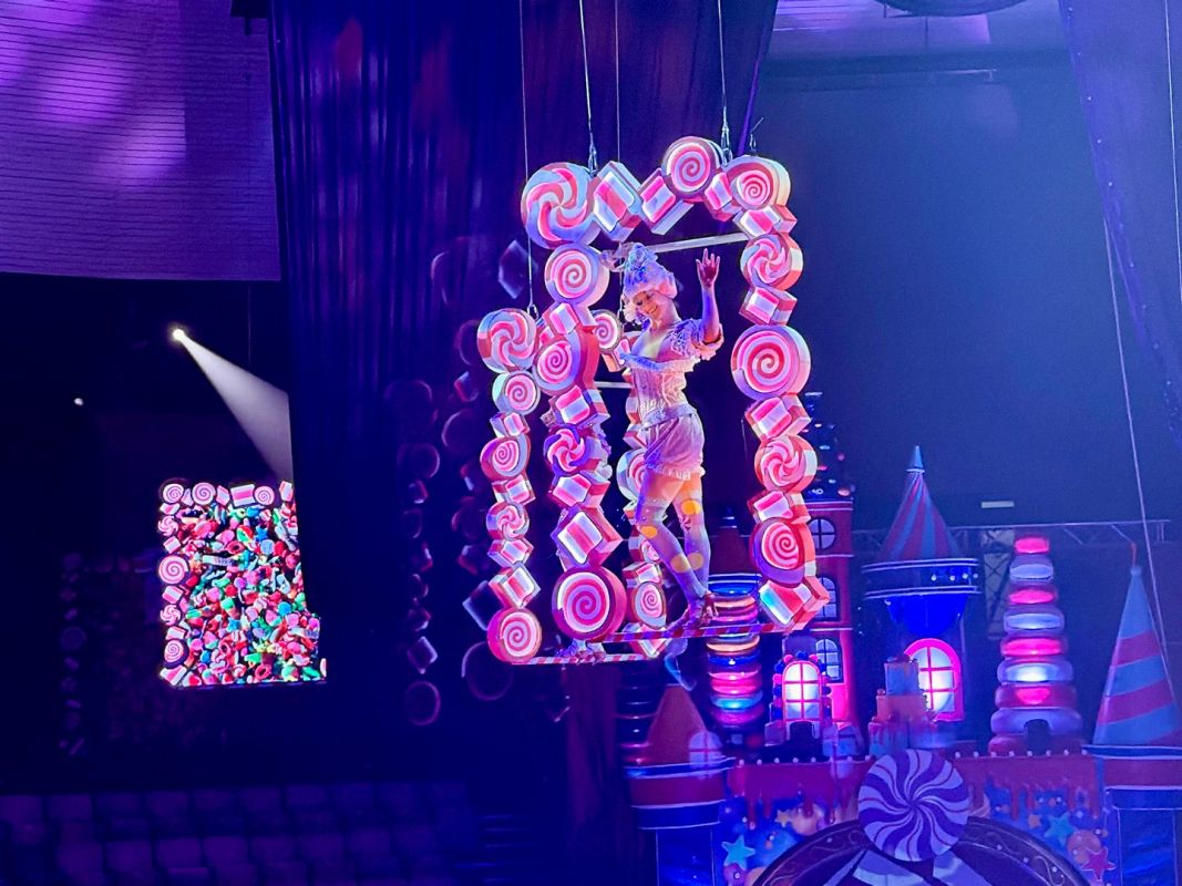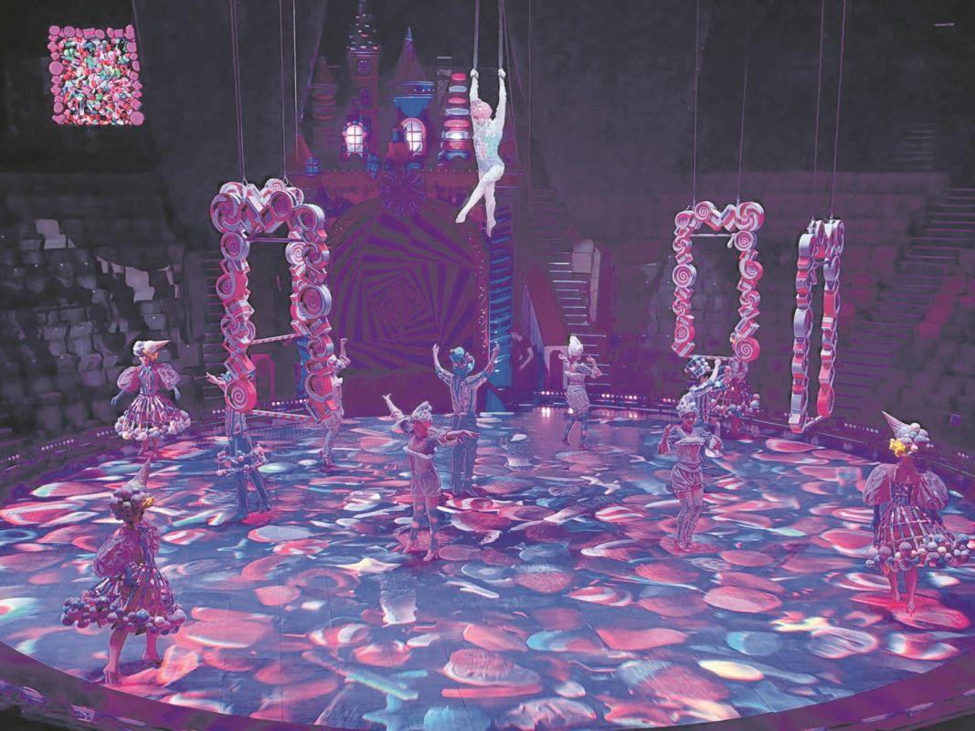 Одна из изюминок программы: единственный в стране манеж из 736 жидкокристаллических экранов. Вместо привычного ковра в манеже — яркая картинка под ногами артистов. Она постоянно меняется, погружая зал в атмосферу кондитерской сказки.